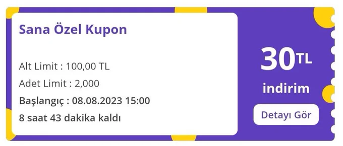 2 Ağustos 2023 Pazartesi gününe özel kupon30 indirim koduyla 100 TL ve üzeri 30 TL indirim kampanyası başladı.